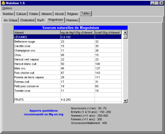 Nutrition est un utilitaire qui se présente sous forme d'onglets affichant la teneur des aliments en calcium, magnésium, folates. Un onglet propose la répartition en glucides, protides, lipides, ainsi que la valeur