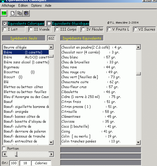 Ce logiciel de nutrition permet d'afficher les équivalences caloriques ou